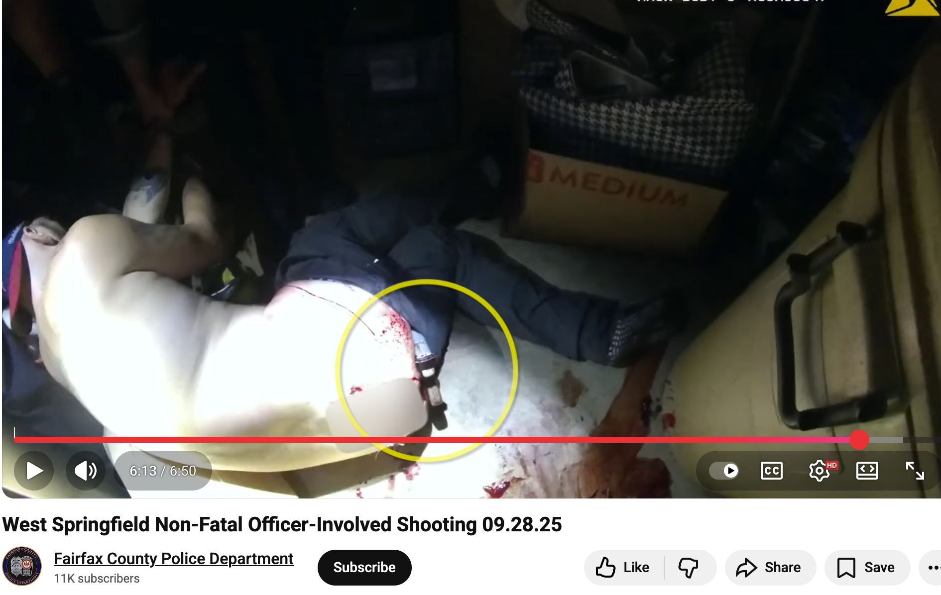 Police circle the gun in the waistband of the man as viewed in the police body-worn camera image of Fairfax County Police non-fatal officer-involved shooting in Burke.