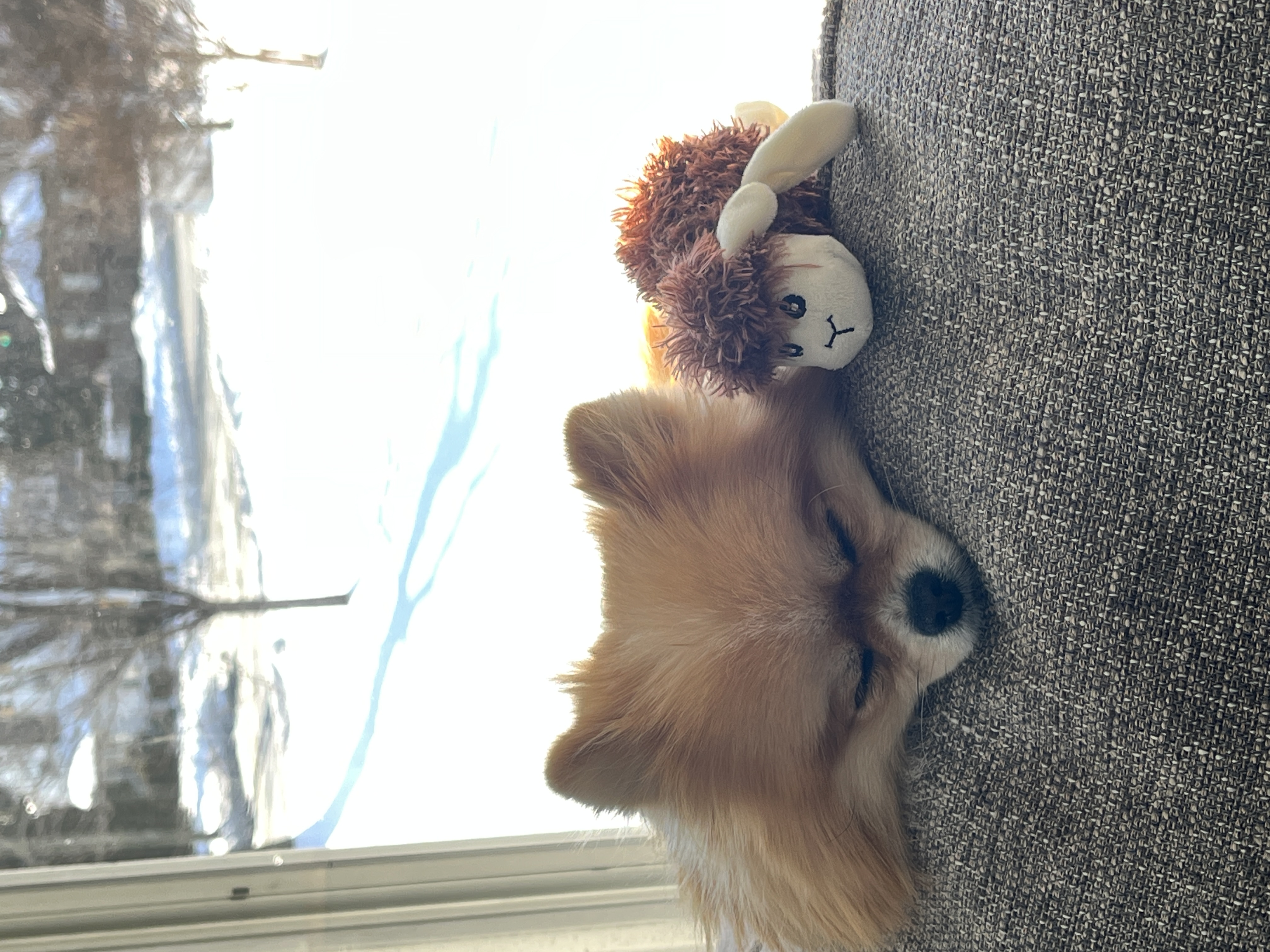 Day 3, Jan. 27: Oshi, a Pomeranian, sleeps on the back of a sofa Tuesday, Jan. 27 in Fairfax County, hoping to find a patch of sunlight. With neighborhood sidewalks blocked by impenetrable "snow-crete," the dog remains indoors with her toy, avoiding the ice and record-breaking cold.