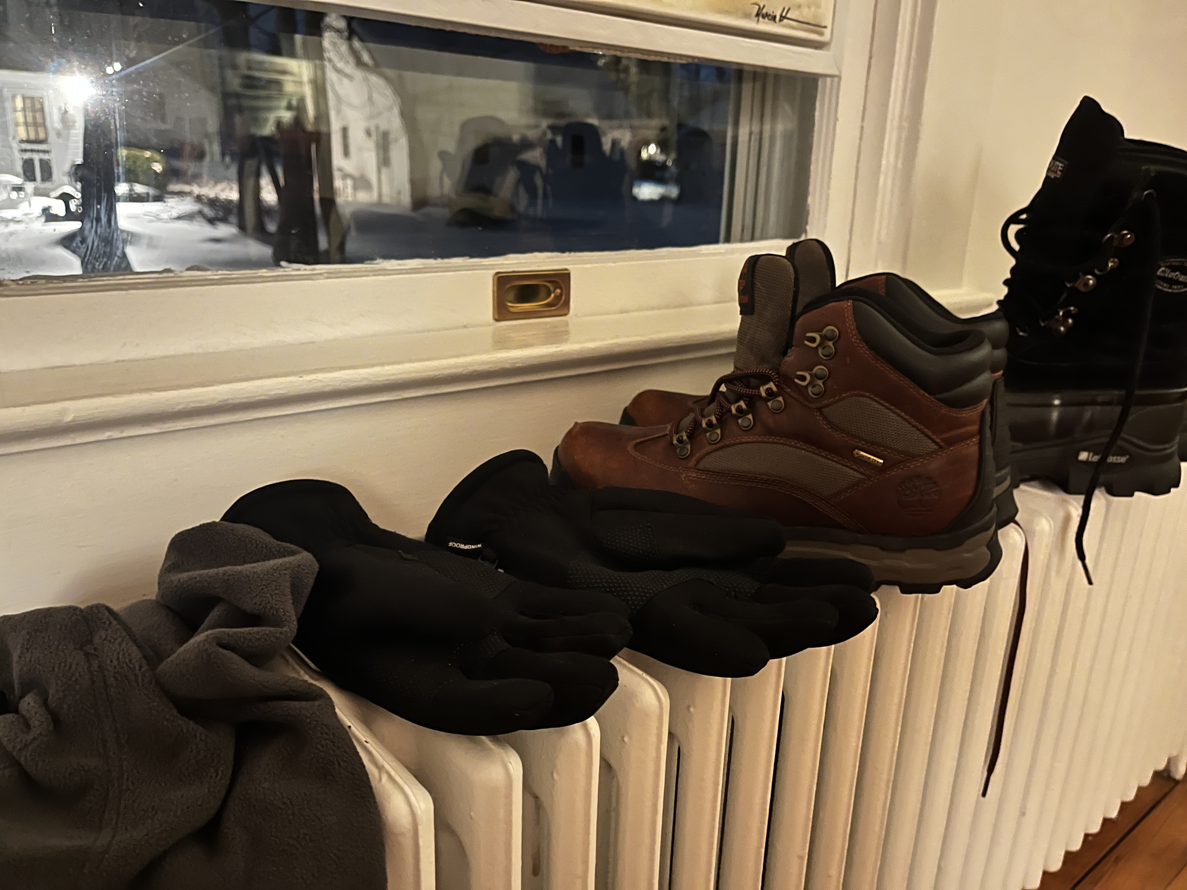 Day 3, Jan. 27: A balaclava, gloves and two pairs of boots dry on a radiator Tuesday, Jan. 27 in Fairfax County. Repeated attempts to clear the frozen "ice-crete" yield only a few feet of progress into the driveway, forcing the resident to come inside and melt snow off his gear before the next round of shoveling.
