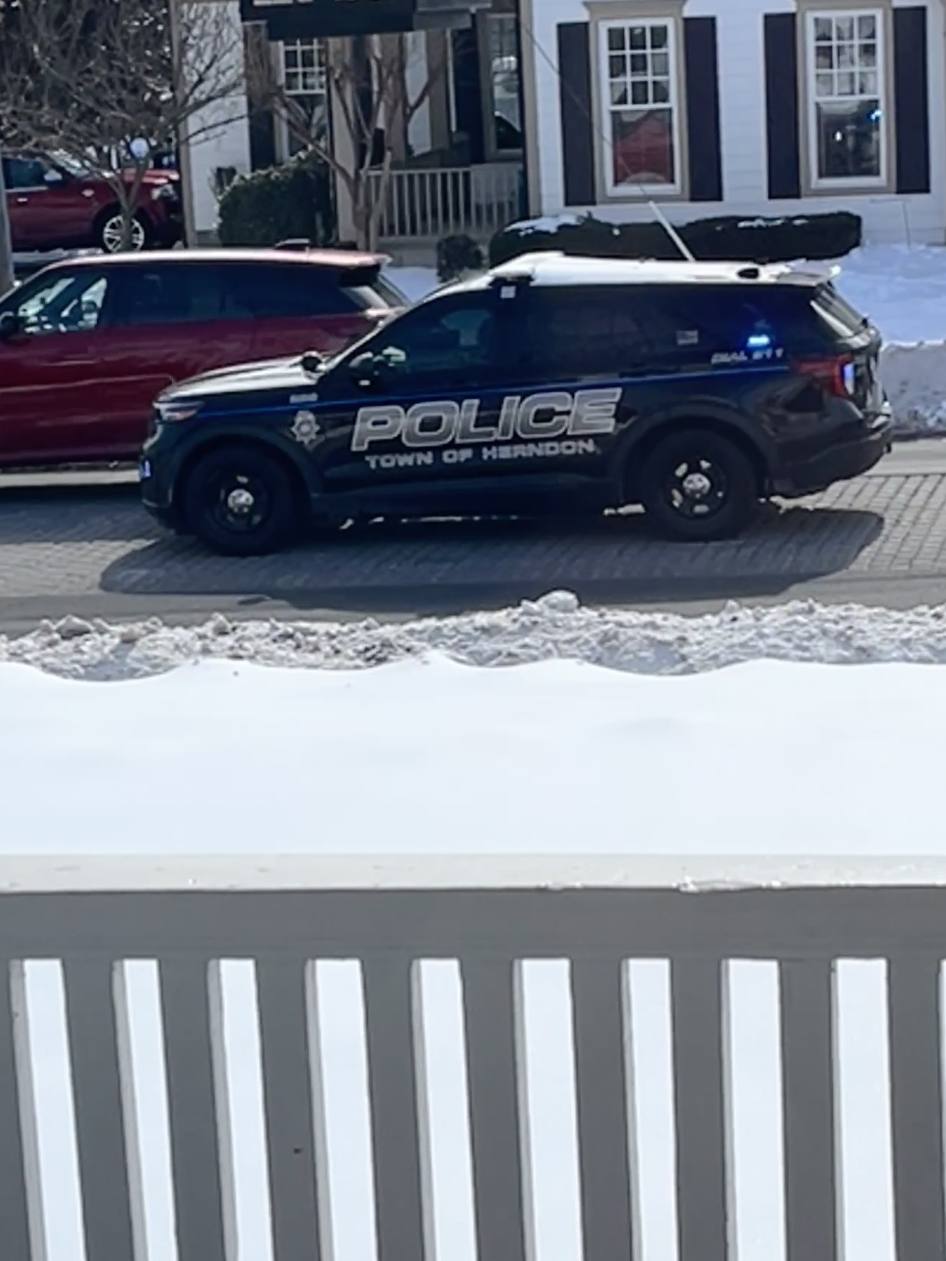 Day 6, Jan. 30: A Town of Herndon police cruiser waits at a red light with a layer of snow on its roof while the car ahead remains completely cleared Friday, Jan. 30. Failing to clear snow from a vehicle roof can create dangerous conditions for trailing drivers, especially with the region's "ice-crete.”